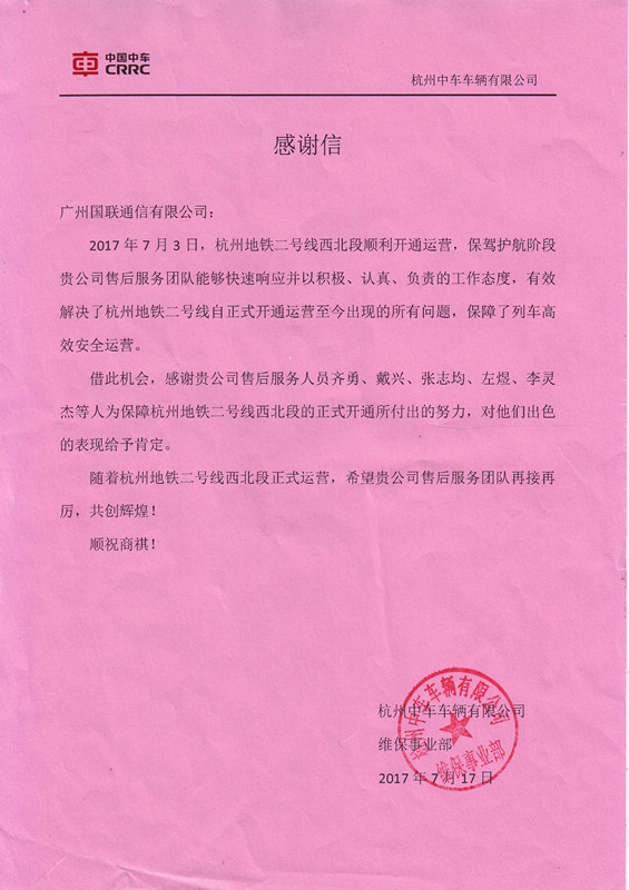 7月17日,杭州中車車輛有限公司向我國聯公司發來感謝信,這封感謝信充滿著對國聯公司優質服務的高度肯定和贊揚,更是對國聯公司工程部售后維修員工恪守敬業,不畏困難,高效服務的最高褒獎。