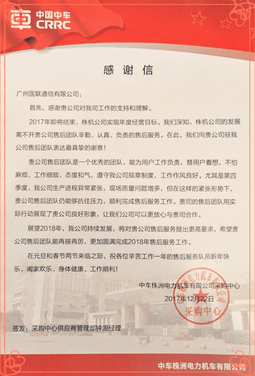 2017年12月底,廣州國聯喜獲中車株洲電力機車有限公司的感謝信,感謝國聯售後團隊在過去的2017年的努力和付出,對國聯售後團隊的高效工作給予肯定。